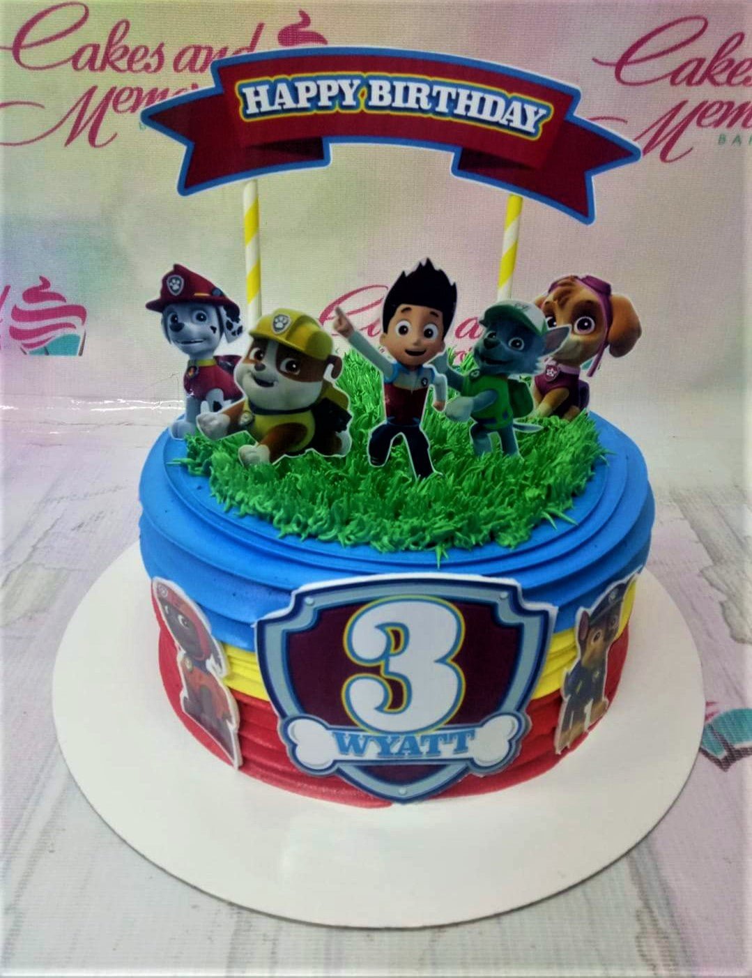 Paw Patrol themed birthday cake with blue, yellow, and red horizontal icing stripes, green grass icing on top, and character printouts.