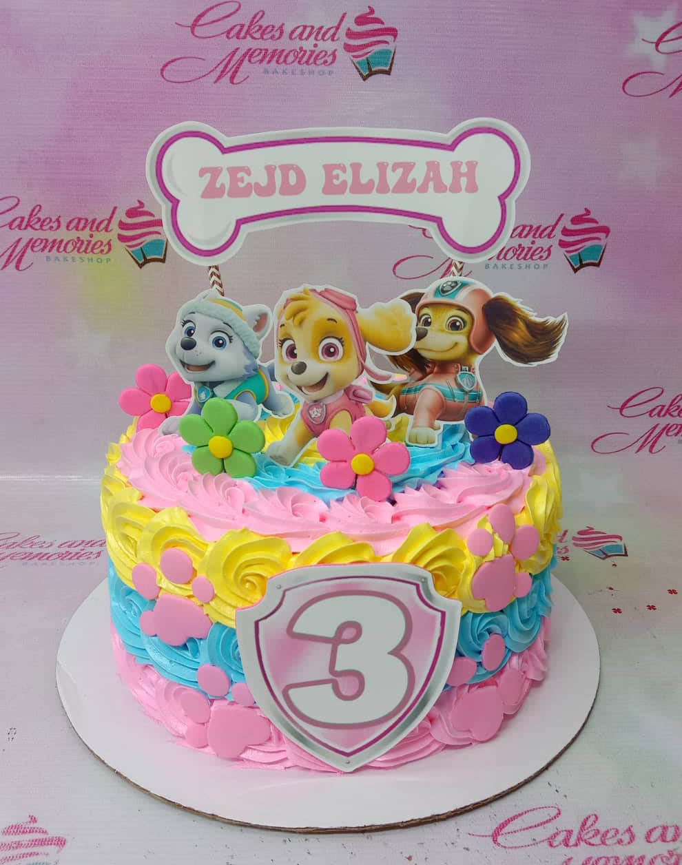 Colorful Paw Patrol themed birthday cake with pink, yellow, and blue icing rosettes and character toppers.