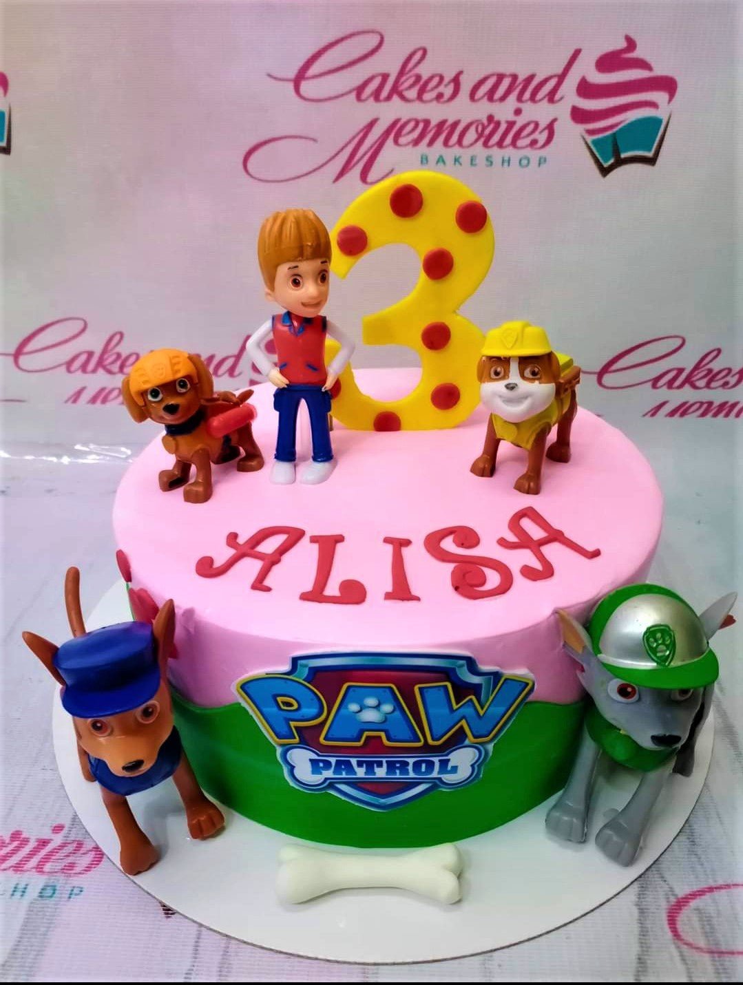 Pink Paw Patrol birthday cake with 3D character figures, a yellow number 3 topper, and a green grass-like base.