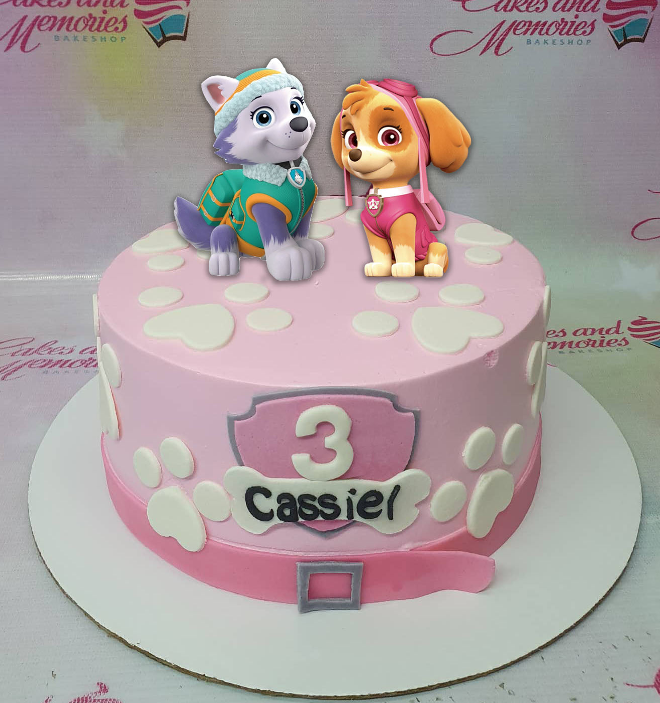 Pink Paw Patrol themed birthday cake featuring Skye and Everest printout toppers with white paw print fondant decorations.