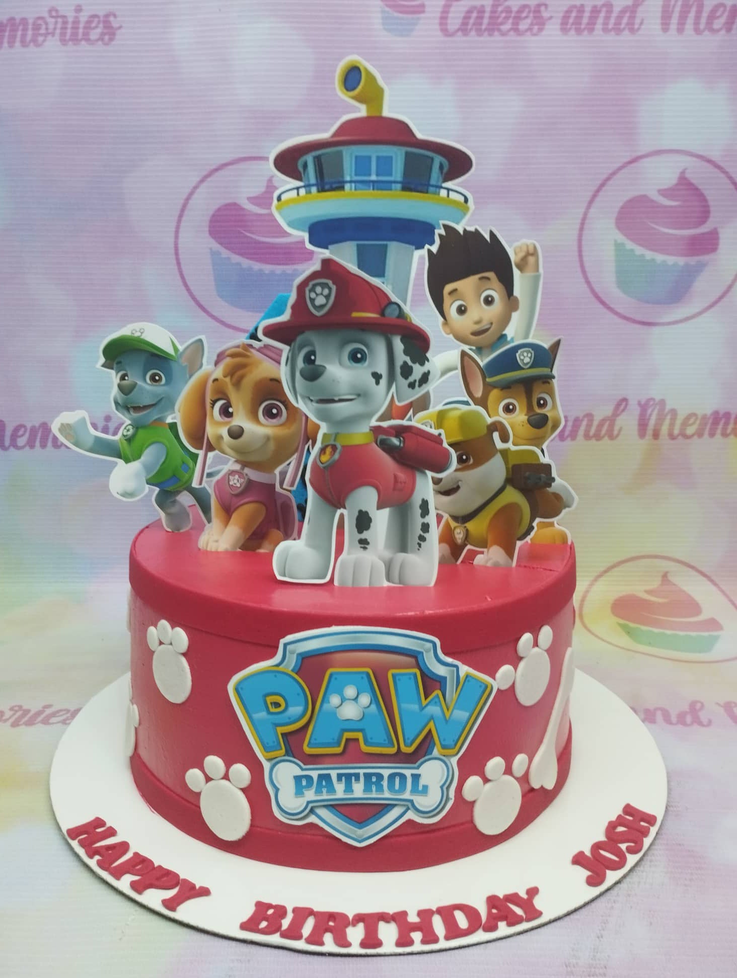 Red Paw Patrol birthday cake with character printouts, white paw prints, and a large logo on the side.