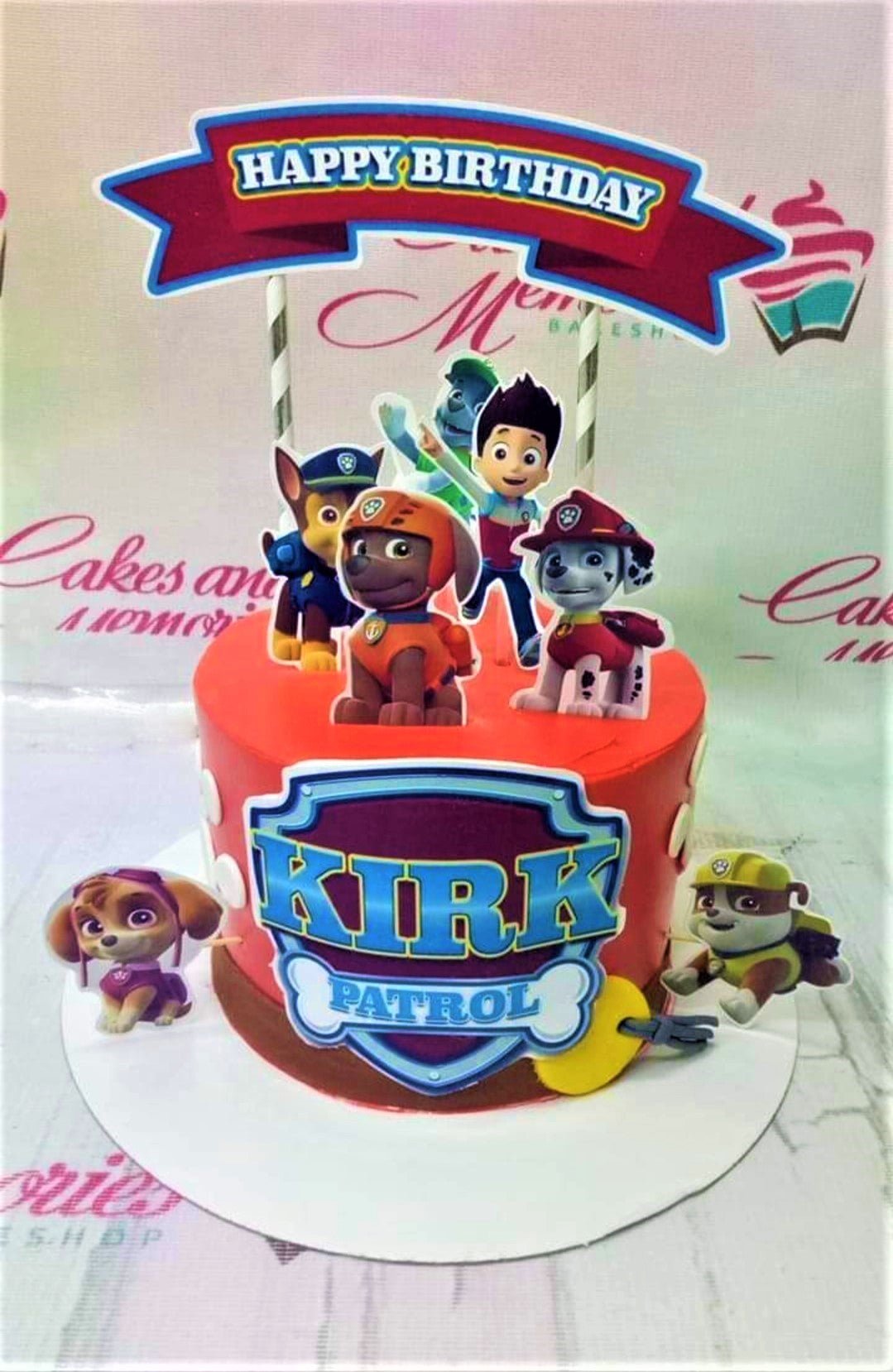 Red Paw Patrol themed birthday cake for Kirk featuring Ryder and the pups with a large custom name shield.
