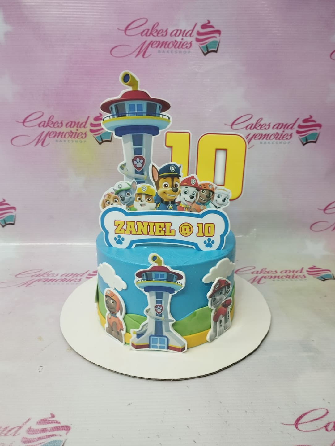 Blue Paw Patrol themed birthday cake for Zaniel's 10th birthday featuring character printouts and a lookout tower topper.