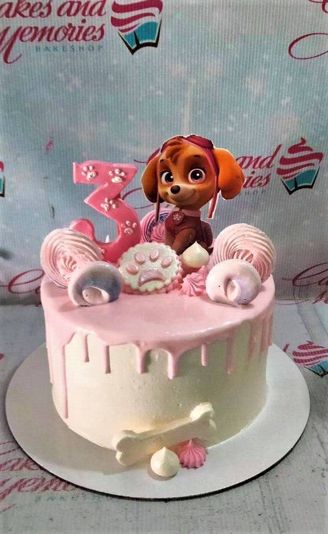 Pink and white Paw Patrol Skye themed birthday cake with pink drip, meringue kisses, and a Skye character topper.
