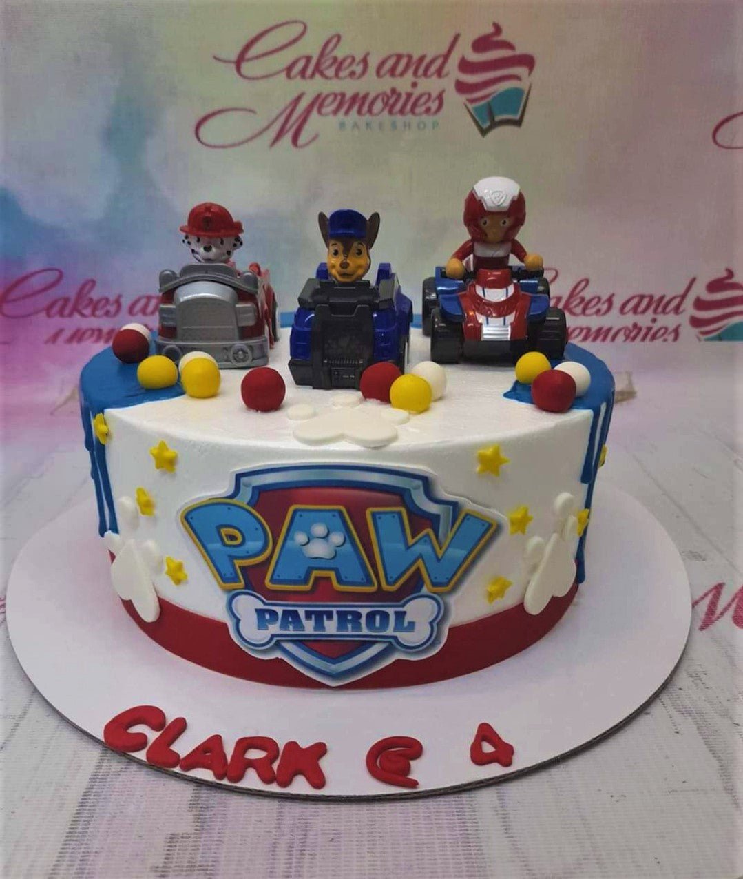 White 1-tier Paw Patrol birthday cake with blue drip, red base border, and toy character toppers on top.