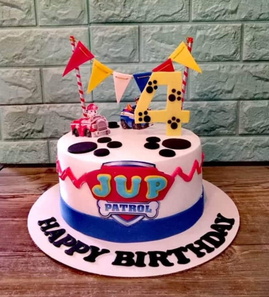 Paw Patrol themed 1-tier fondant cake with Marshall and Chase printouts, a yellow number 4, and a custom Jup Patrol logo.