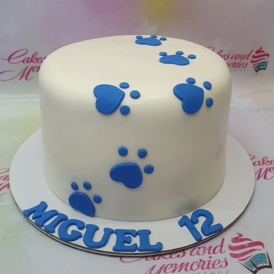 White fondant cake with blue paw print decorations and blue gumpaste letters for Miguel's 12th birthday.