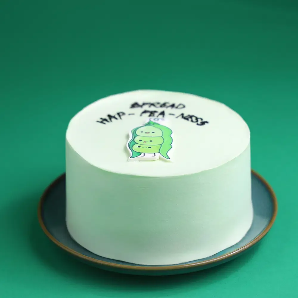 Light green bento cake with a cute pea pod printout and the message Spread Hap-pea-ness in black icing.