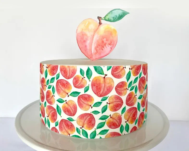 White single tier cake featuring a watercolor peach pattern on the sides and a large peach printout topper on top.