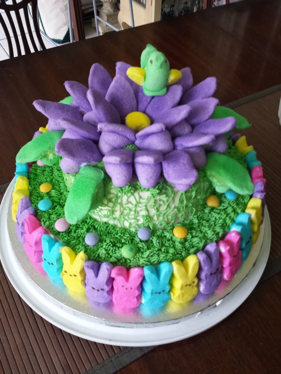 A colorful round cake decorated with purple marshmallow flower petals, green icing grass, and multi-colored Peeps marshmallow bunnies around the base.