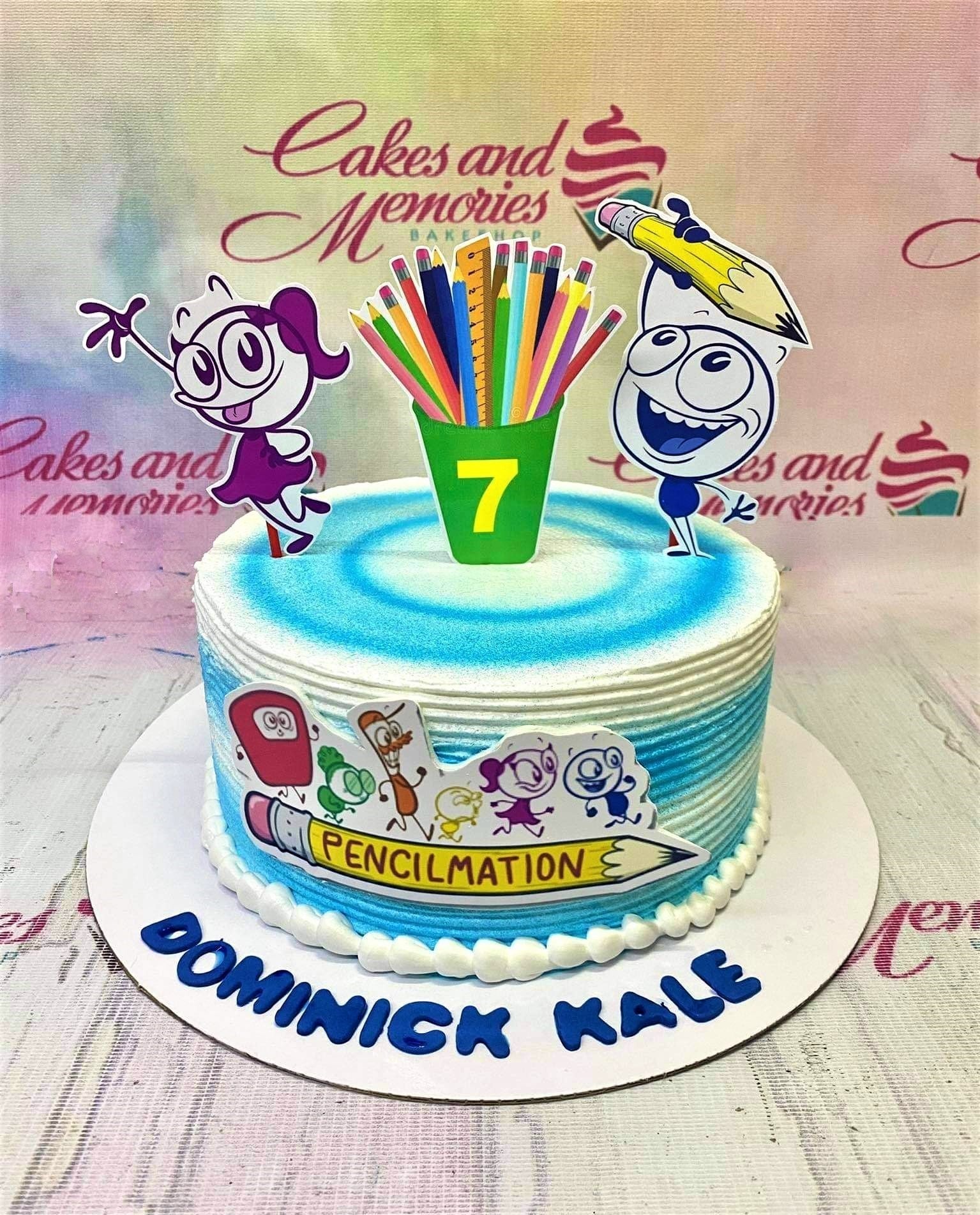 Pencilmation themed birthday cake with blue and white gradient icing and character printouts.