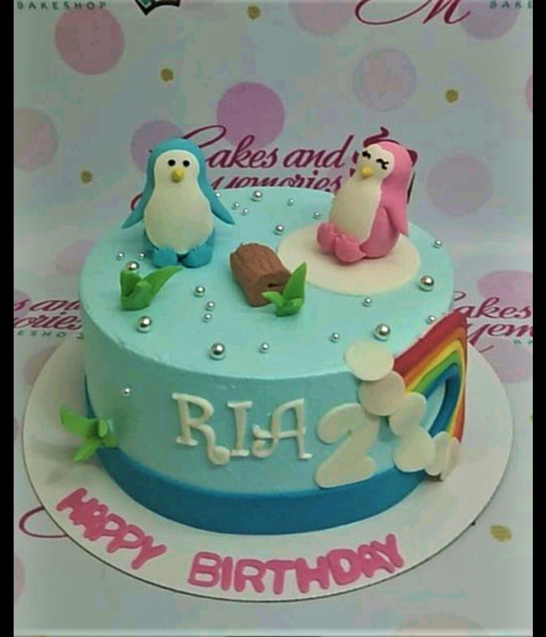 Light blue penguin themed birthday cake with a pink and blue penguin topper, rainbow, and silver dragees.