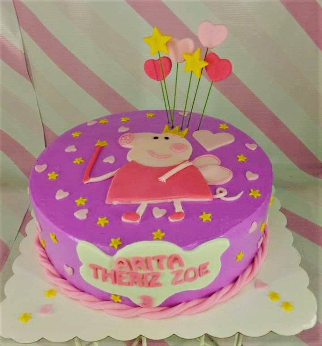 Purple Peppa Pig fairy themed birthday cake with pink icing borders and yellow stars.