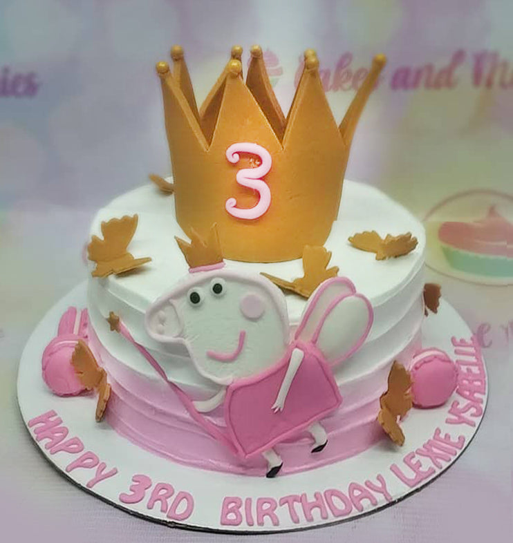 Peppa Pig fairy themed birthday cake with a large gold crown, pink ombre icing, and a Peppa Pig printout topper.