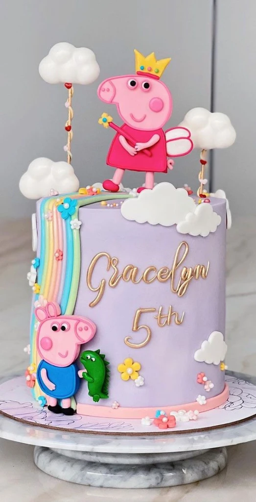 Lavender Peppa Pig themed birthday cake with fondant rainbow, clouds, and 3D Peppa and George figures.