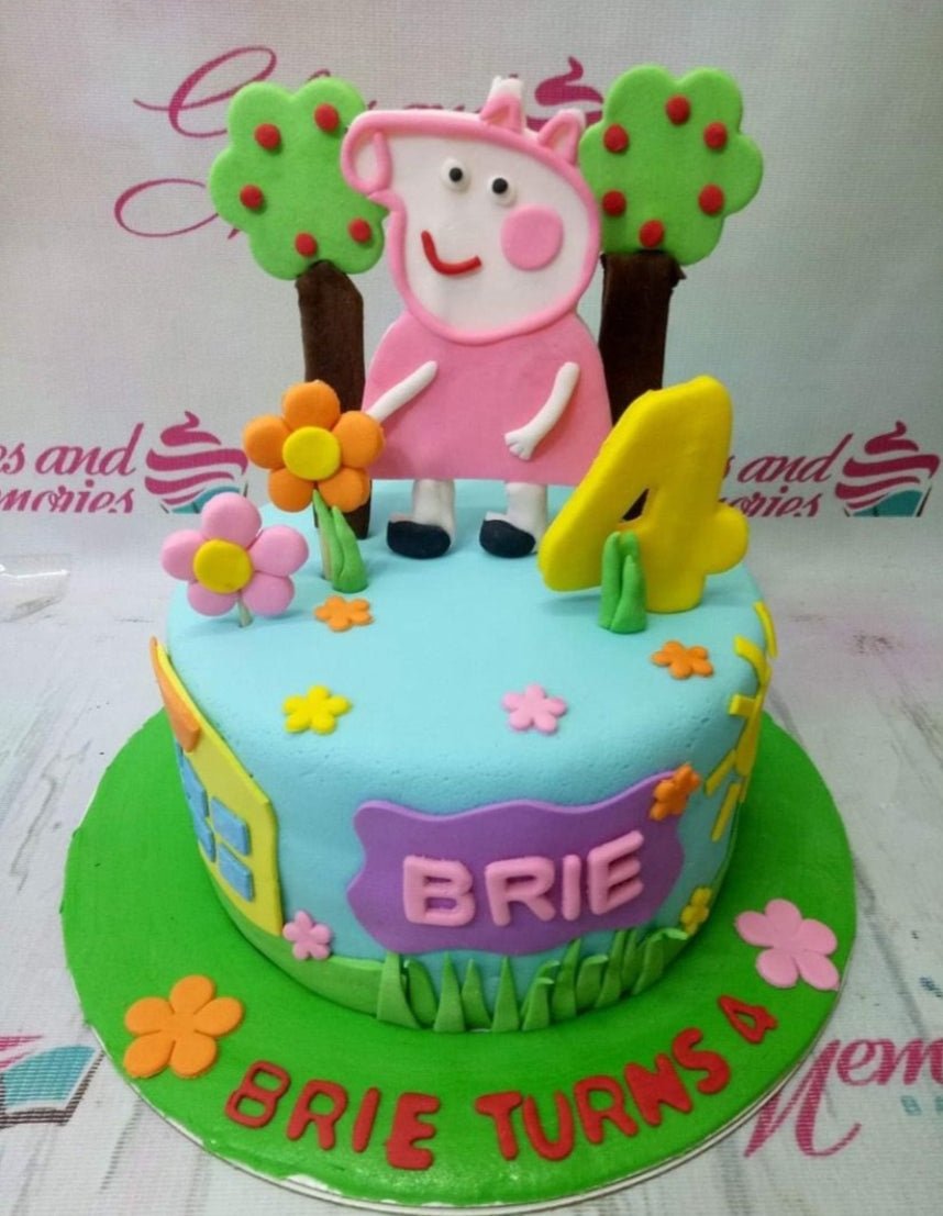 Peppa Pig themed light blue fondant cake with 3D fondant figures of Peppa, trees, and flowers for a 4th birthday.