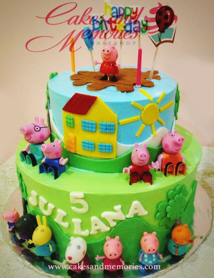 Two-tier Peppa Pig themed birthday cake with green and blue fondant, featuring various character figurines and a yellow house decoration.