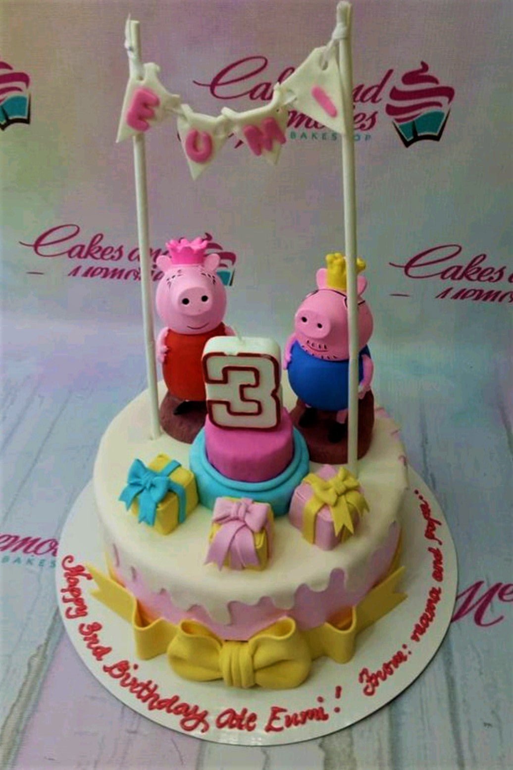Peppa Pig themed 1-tier fondant cake with 3D Peppa and George figures, gift boxes, and a banner topper.