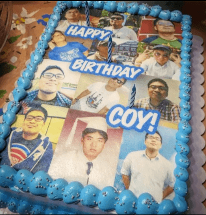 Rectangle photo collage cake with blue icing borders and silver sprinkles for a birthday celebration.