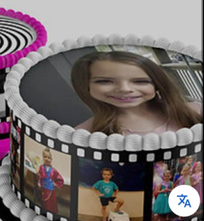 A white round cake featuring a film strip wrap with personal photos and a large photo of a young girl on the top surface.