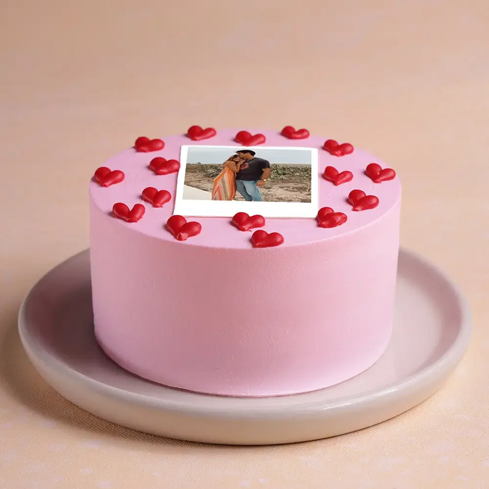Pink minimalist cake with a polaroid-style photo print and red icing hearts on top.