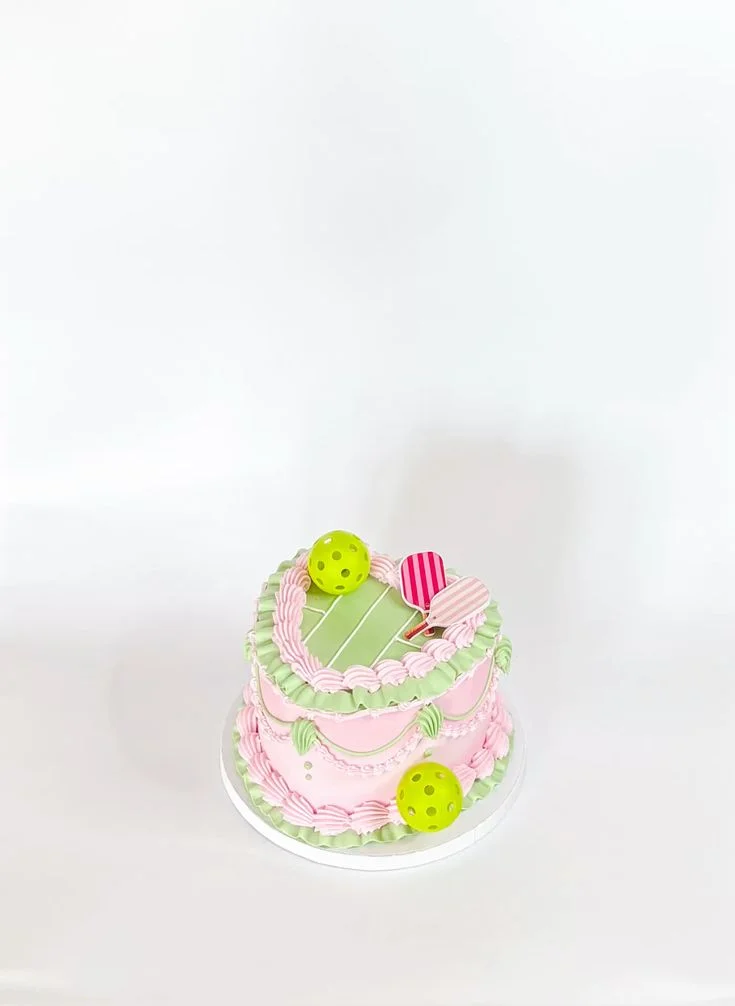 Pink heart-shaped pickleball cake with green court design, pink paddles, and lime green balls.