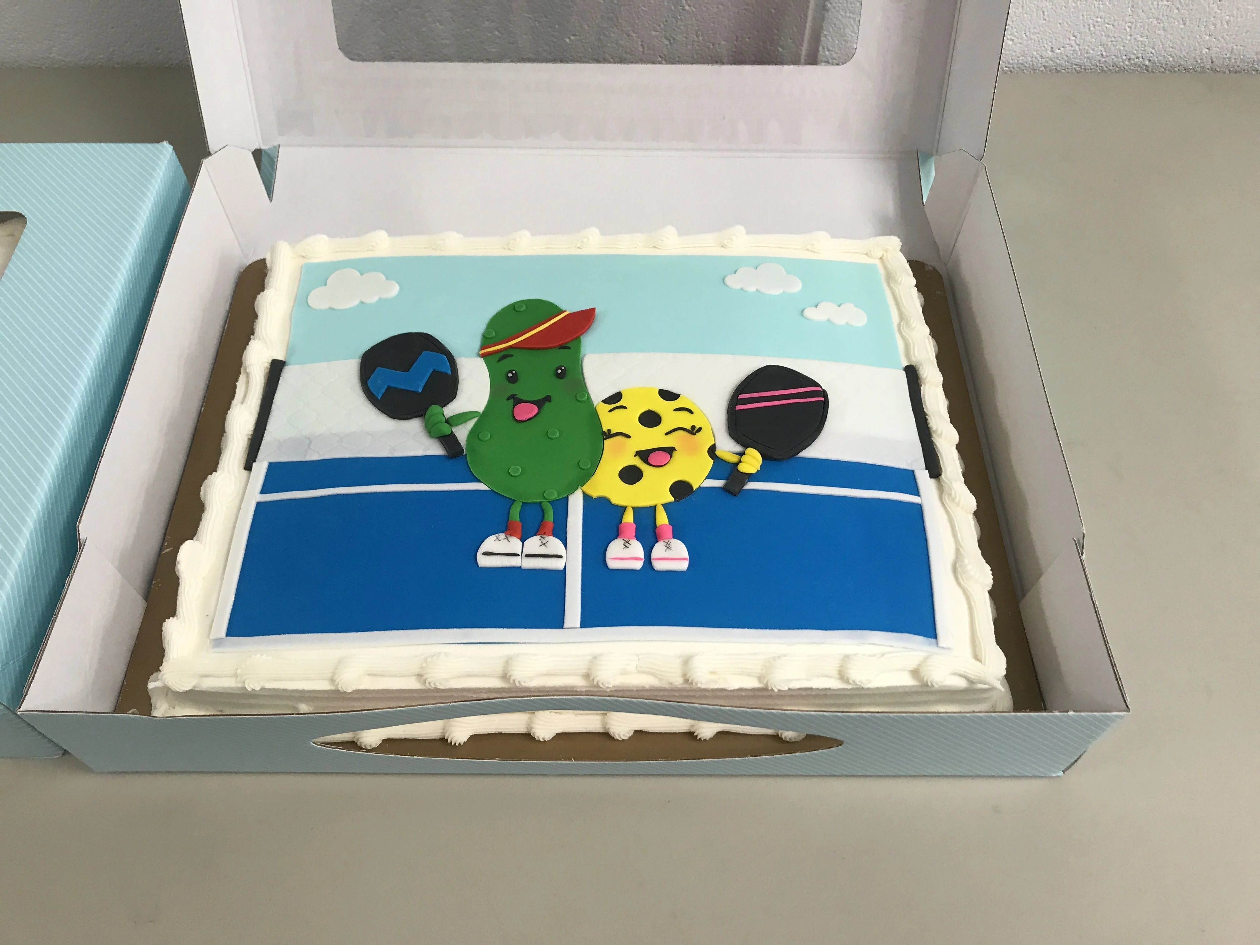 Rectangle pickleball themed cake with green pickle and yellow ball characters on a blue and white court design.