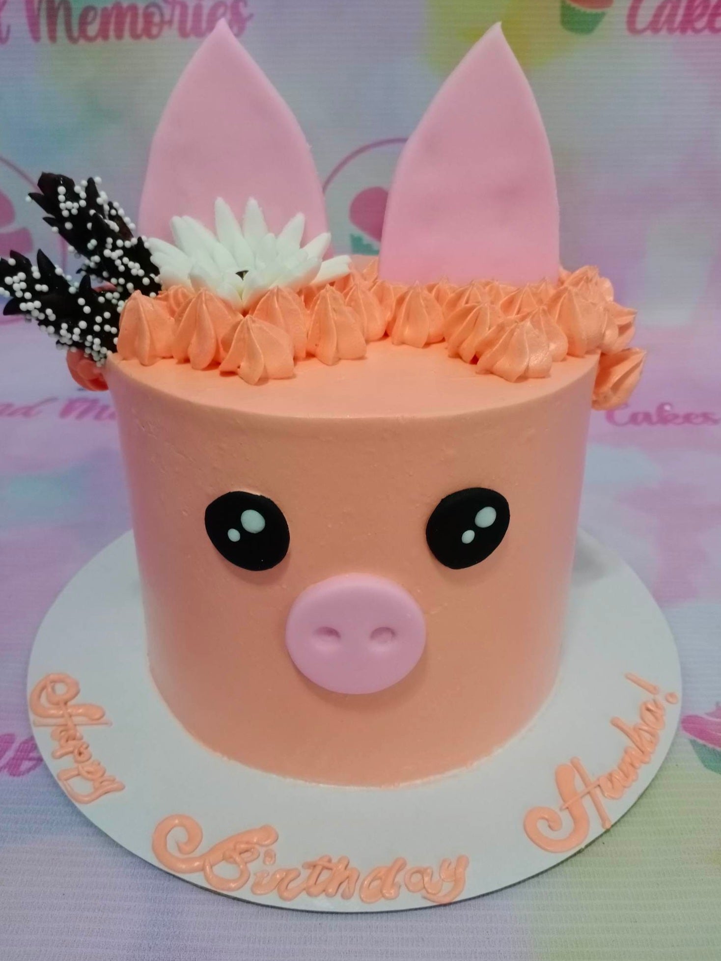 Peach pig-themed birthday cake with fondant ears, snout, and black eyes, topped with peach icing swirls and chocolate sticks.