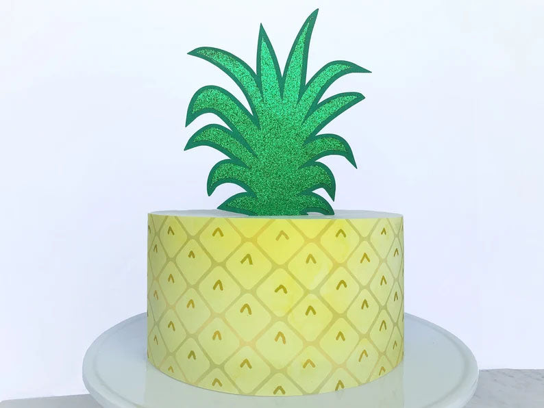 Single tier pineapple themed cake with yellow patterned icing and a large green glittery pineapple leaf topper.