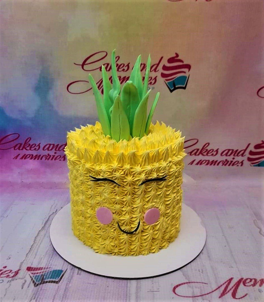 Yellow pineapple-shaped cake with green fondant leaves on top and a cute smiling face with pink cheeks.