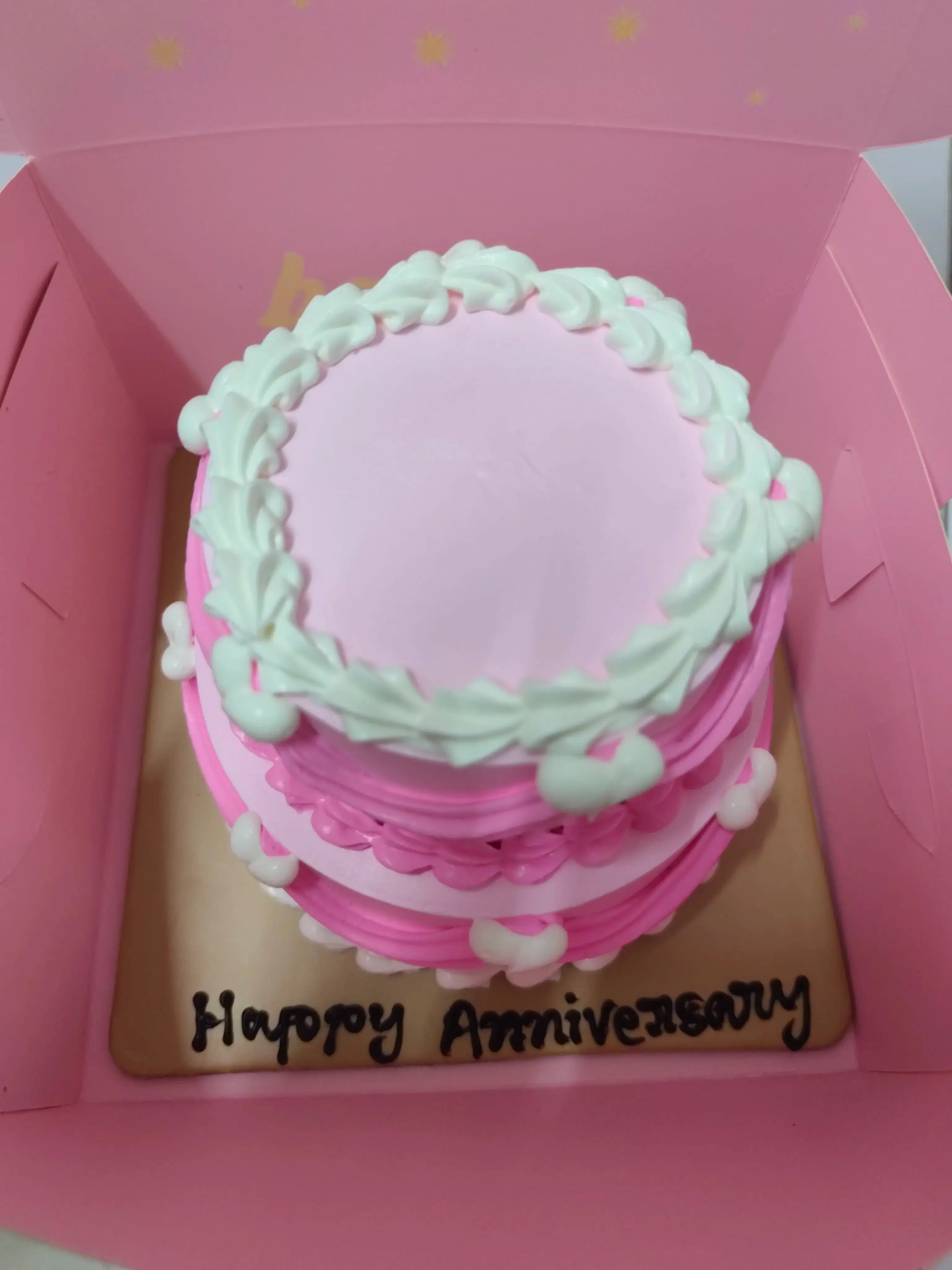Pink and white minimalist bento cake with ruffled icing borders and a Happy Anniversary message on the board.