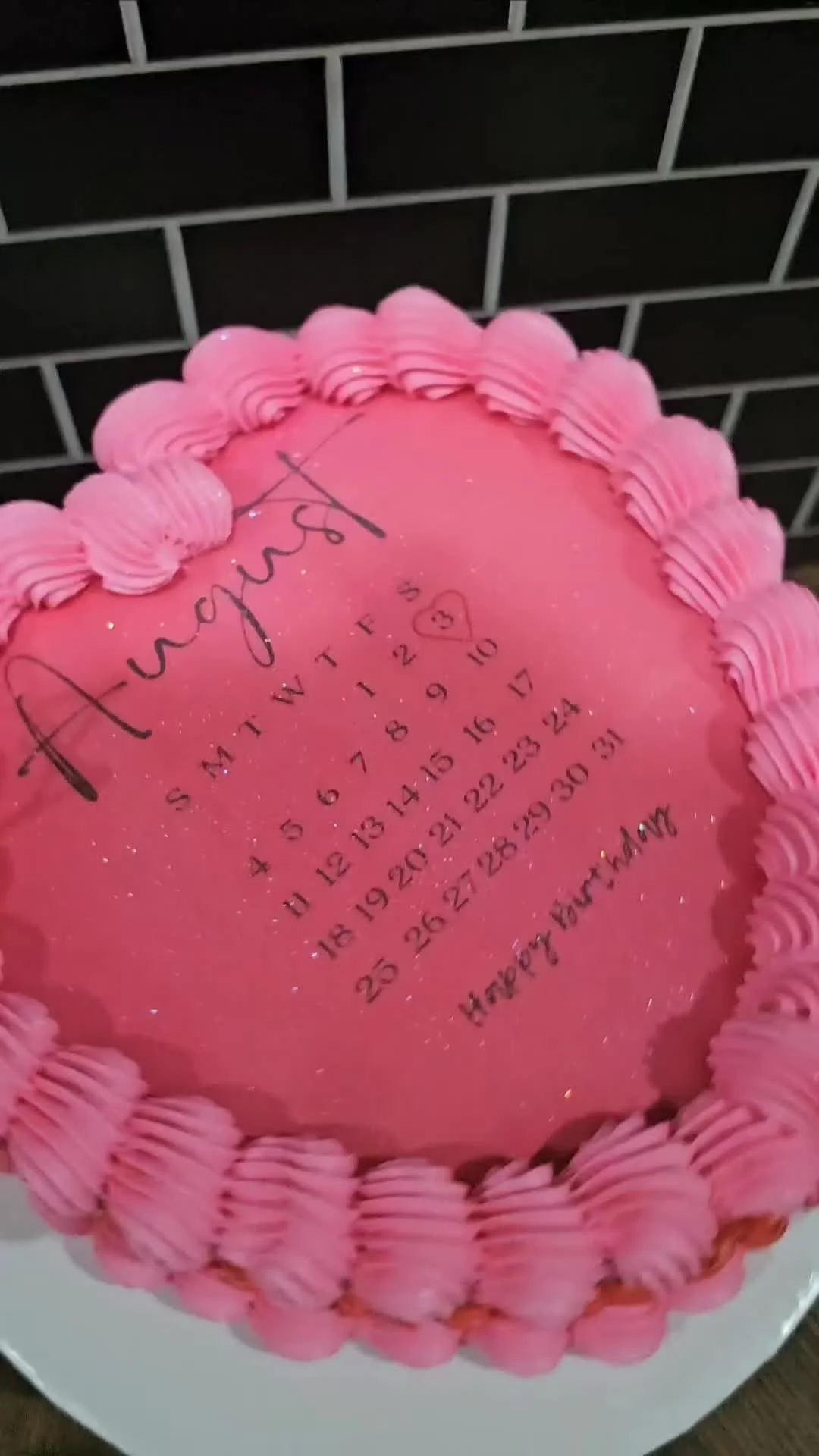 Heart-shaped pink minimalist cake with a black August calendar design and piped pink icing borders.