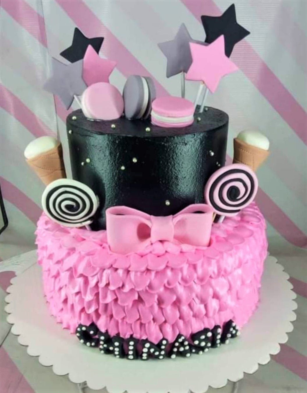 Two-tier pink and black cake with pink icing ruffles, black top tier, pink bow, macarons, and star toppers.