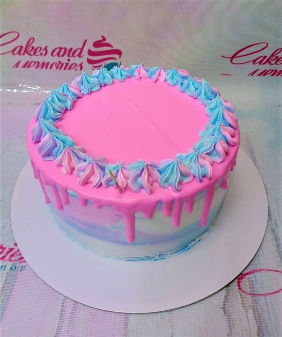 This vibrant 1-tier pink and blue watercolor cake is perfect for birthdays or gender reveal celebrations. The design features a smooth watercolor icing base with a bold pink chocolate drip cascading down the sides. The top is elegantly finished with a full border of two-tone pink and blue icing rosettes. While this specific cake has no written message, its colorful design makes it a standout centerpiece for any festive occasion. This eye-catching creation is ideal for making your child's celebration truly memorable. Order your custom cake today through Genie.ph for delivery in Cebu City, Mandaue, and Lapu-lapu City.