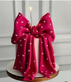 A tall pink fondant cake featuring a large oversized magenta gumpaste bow with white heart patterns and a single lit candle on top.