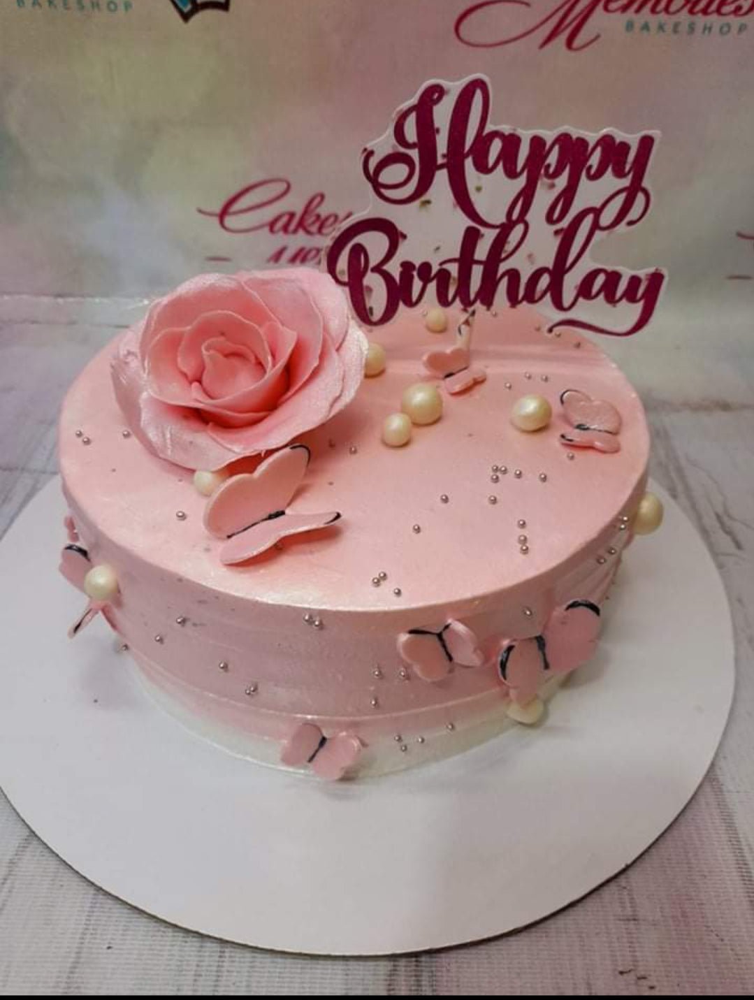 Pink minimalist birthday cake with a large pink fondant rose, pink butterflies, and silver dragees.