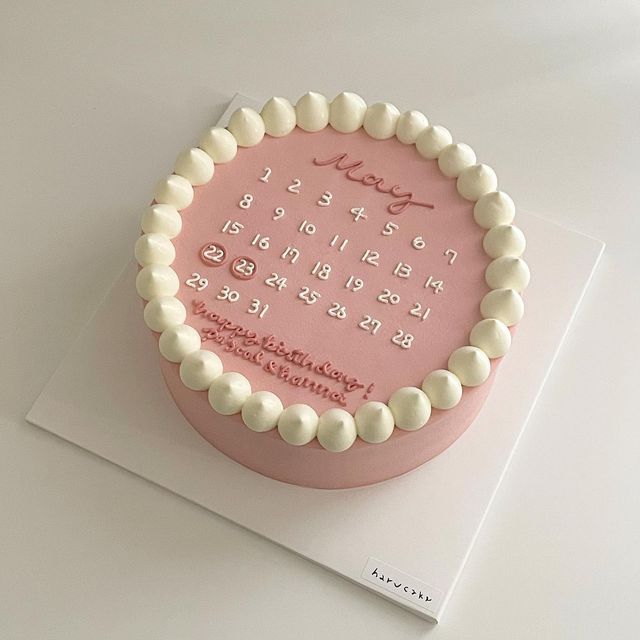 A pink 1 Tier cake featuring a calendar design, white icing text, and white icing dollops.