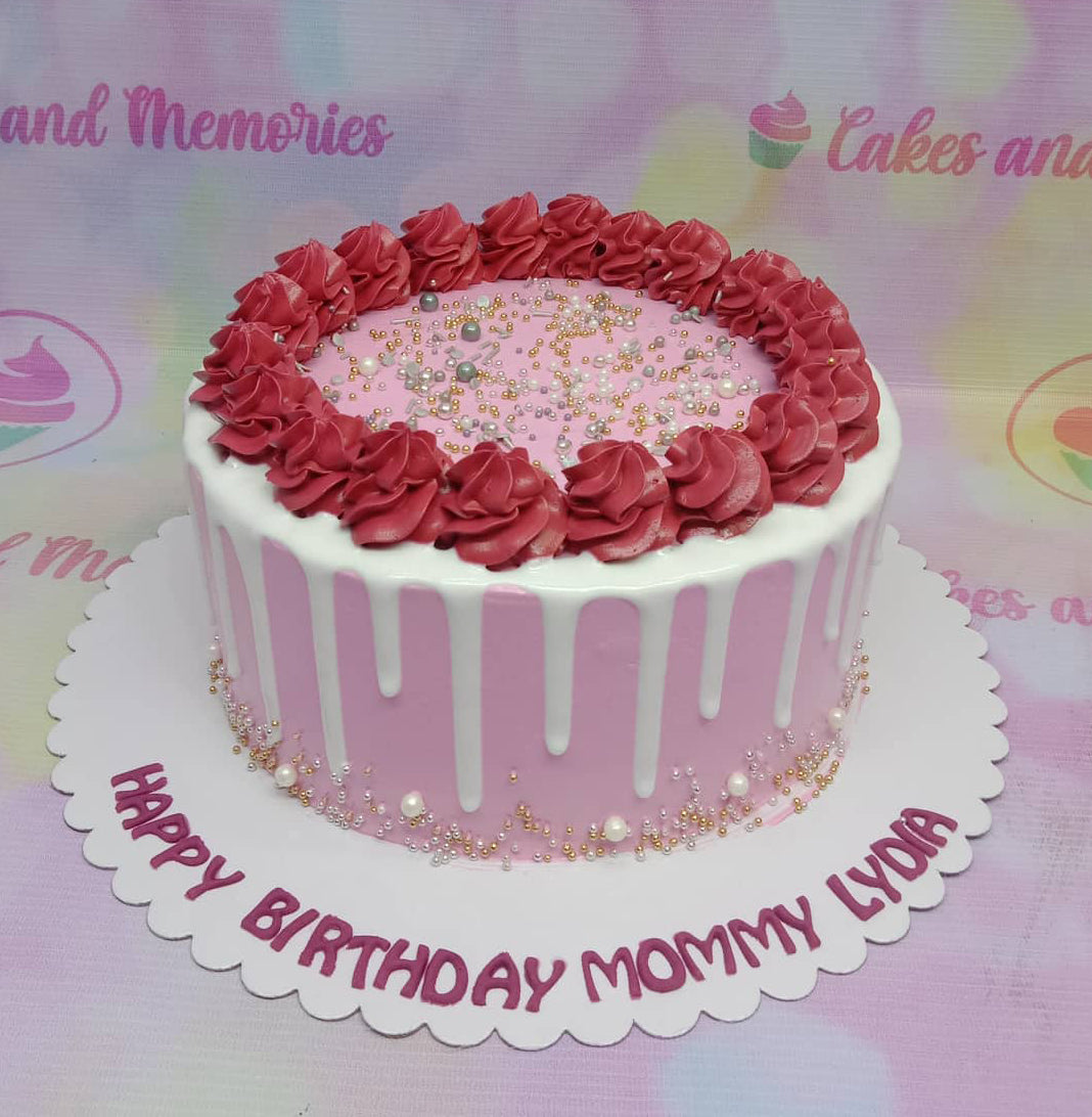 Pink birthday cake with white chocolate drip, dark pink icing rosettes, and gold and silver sprinkles.