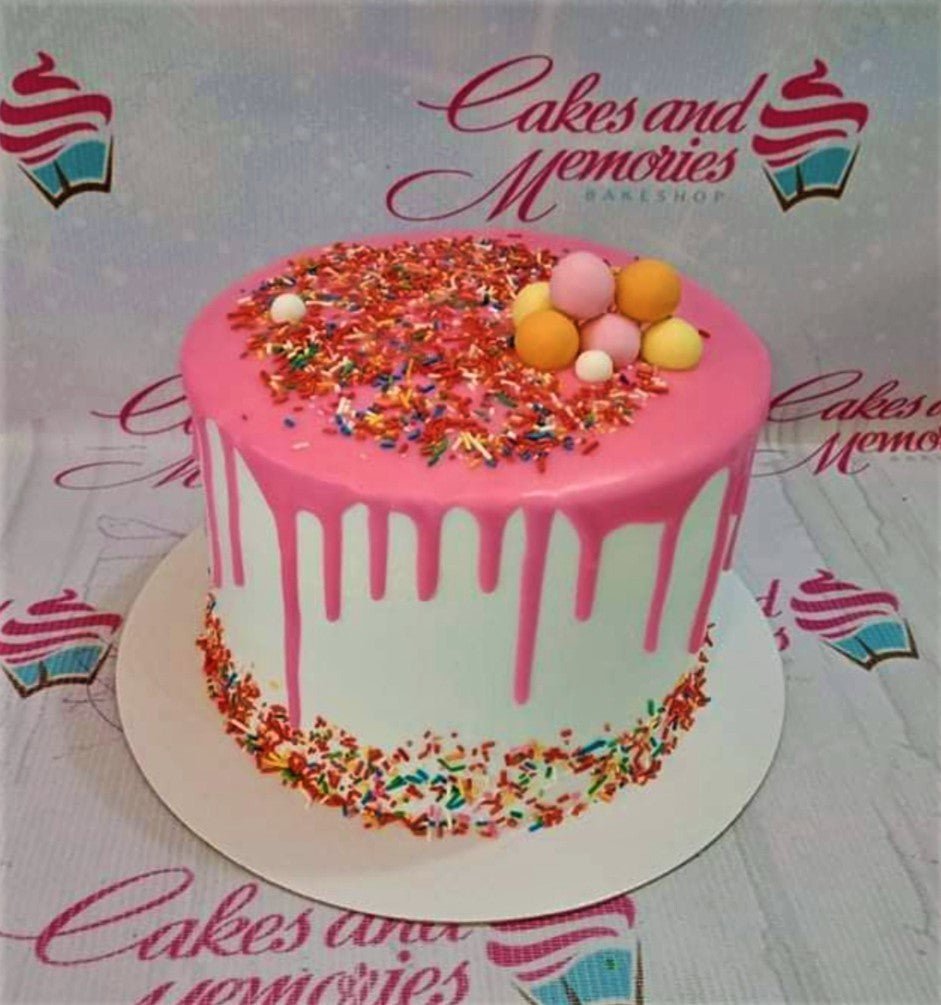 White soft-icing cake with pink drip, colorful sprinkles on top and base, and pink, orange, and yellow fondant balls.