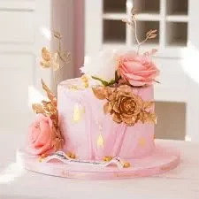 Elegant pink single tier cake decorated with pink and white roses, gold leaves, and gold foil accents on a pink base board.