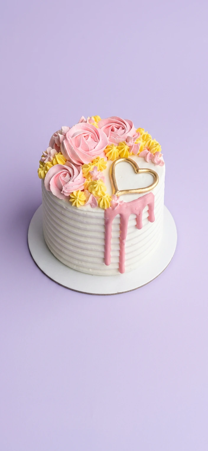 Mini white cake with pink icing rosettes, yellow dollops, a gold heart topper, and pink icing drip.