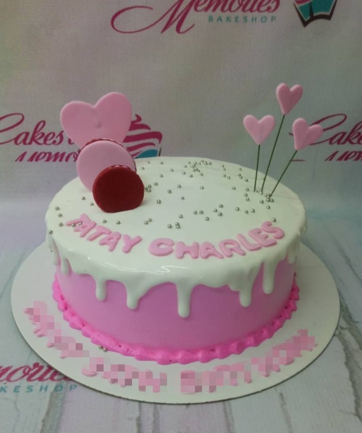 Pink and white drip cake with pink heart toppers, macarons, and silver dragees for a birthday celebration.