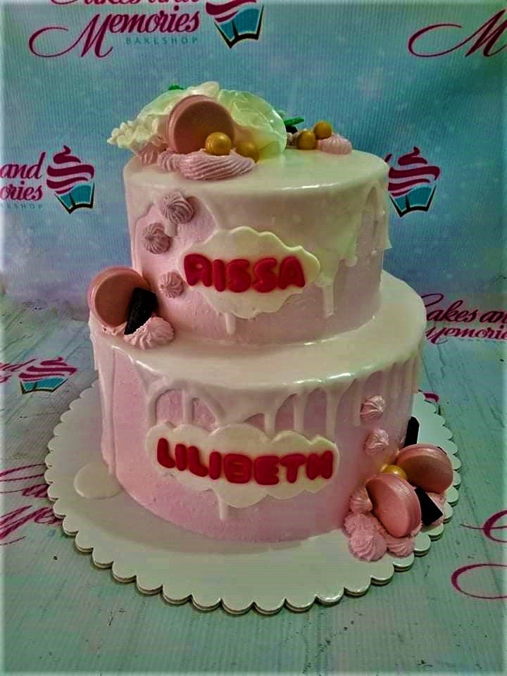 Pink two-tier cake with white drip icing, pink macarons, gold spheres, and red gumpaste names Rissa and Lilibeth.