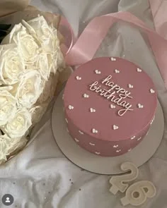 A minimalist pink bento cake with white piped hearts and 'happy birthday' message, accompanied by white roses.