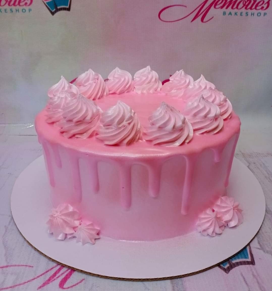 Single tier pink minimalist cake with pink icing drips and large piped icing rosettes on top and base.