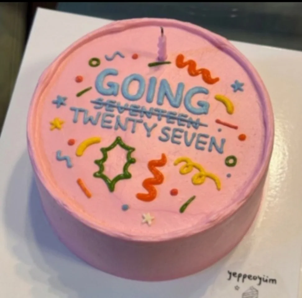 Pink minimalist bento-style cake with colorful piped icing doodles and a birthday message for a 27th birthday.
