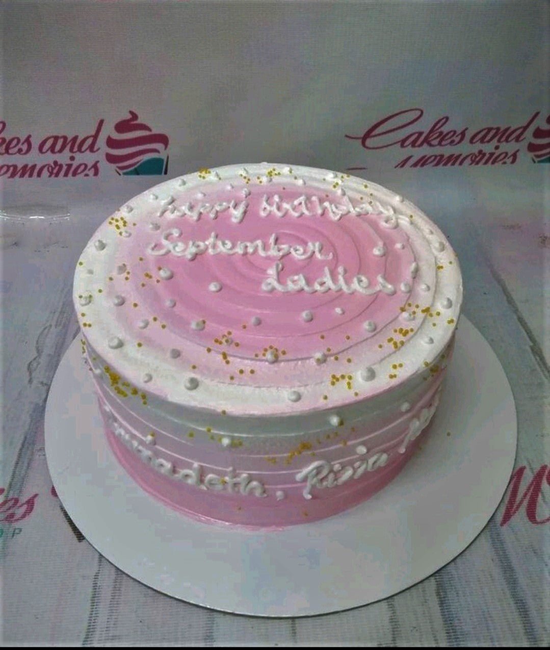 Pink and white ombre minimalist cake with white icing text and gold sprinkles for September ladies.