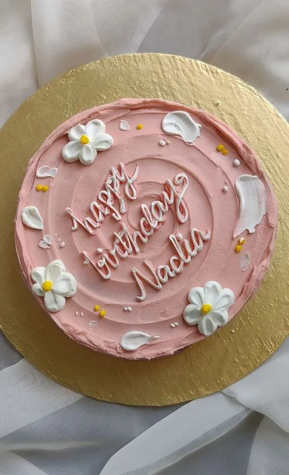 Pink minimalist bento cake with white icing daisies and 'Happy Birthday Nadia' message in white script.