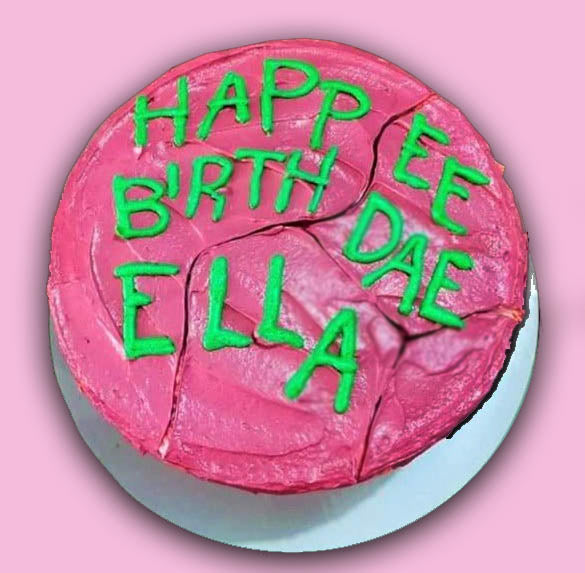 Pink bento cake with green piped icing text reading Happee Birthdae Ella, featuring a rustic palette knife finish.