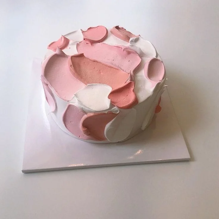 Minimalist white cake with artistic palette knife icing strokes in various shades of pink and peach.